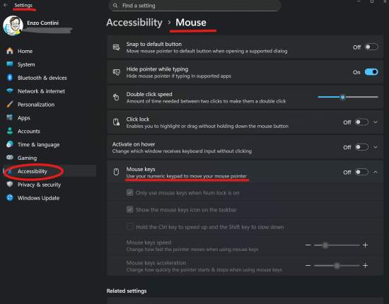 Per ritornare alla visualizzazione normale 1x, si può anche usare Cntl+Alt+Meno (-) che consente di lasciare attiva la Lente pur riportando l’ingradimento a 1x. In questo modo, ripremendo Cntl+Alt+Meno (-) si può ritornare all’ingrandimento che si era raggiunto precedentemente: ad esempio, se si era premuto Windows +++ per un mega ingrandimento, premendo Cntl+Alt+Meno (-) una volta si ritorna alla visualizzazione normale 1x, e ripremendolo una seconda volta si ritorna a quell’ingrandimento mega precedente e così via. In questo modo, una volta scelto l’ingrandimento desiderato (avendo premuto il tasto Windows e un numero sufficiente di volte il +), operando con Cntl+Alt+Meno (-) si può passare alternativamente alla visualizzazione normale e poi successivamente a quell’ingrandimento desiderato, ad esempio quanto si vuole ingrandire un’altra parte dell’articolo che sta visionando. Andando poi in Impostazioni -> Accessibilità -> Lente di ingrandimento (ENG: Settings ->Accessibility -> Magnifier) si possono impostare ulteriori parametri e scoprire magari altri shortcut. Ad esempio, si scopre che tenendo premuto Cntl+Alt e ruotando la rotella del mouse, si può ingrandire o meno ciò che si sta visualizzando a video e l’ingrandimento viene fatto centrando il tutto sulla posizione corrente del puntatore del mouse: funzionalità assai utile anche durante una presentazione in cui si desideri ingrandire una parte dello schermo proiettato per fare vedere meglio un dettaglio agli uditori!