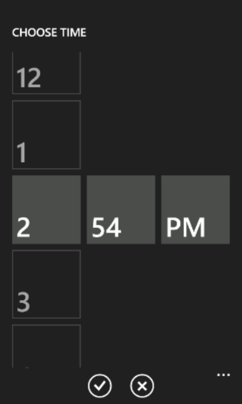 For example if the phone is set region UK and with 24-hour clock at OFF, the TimePicker displays as follows: