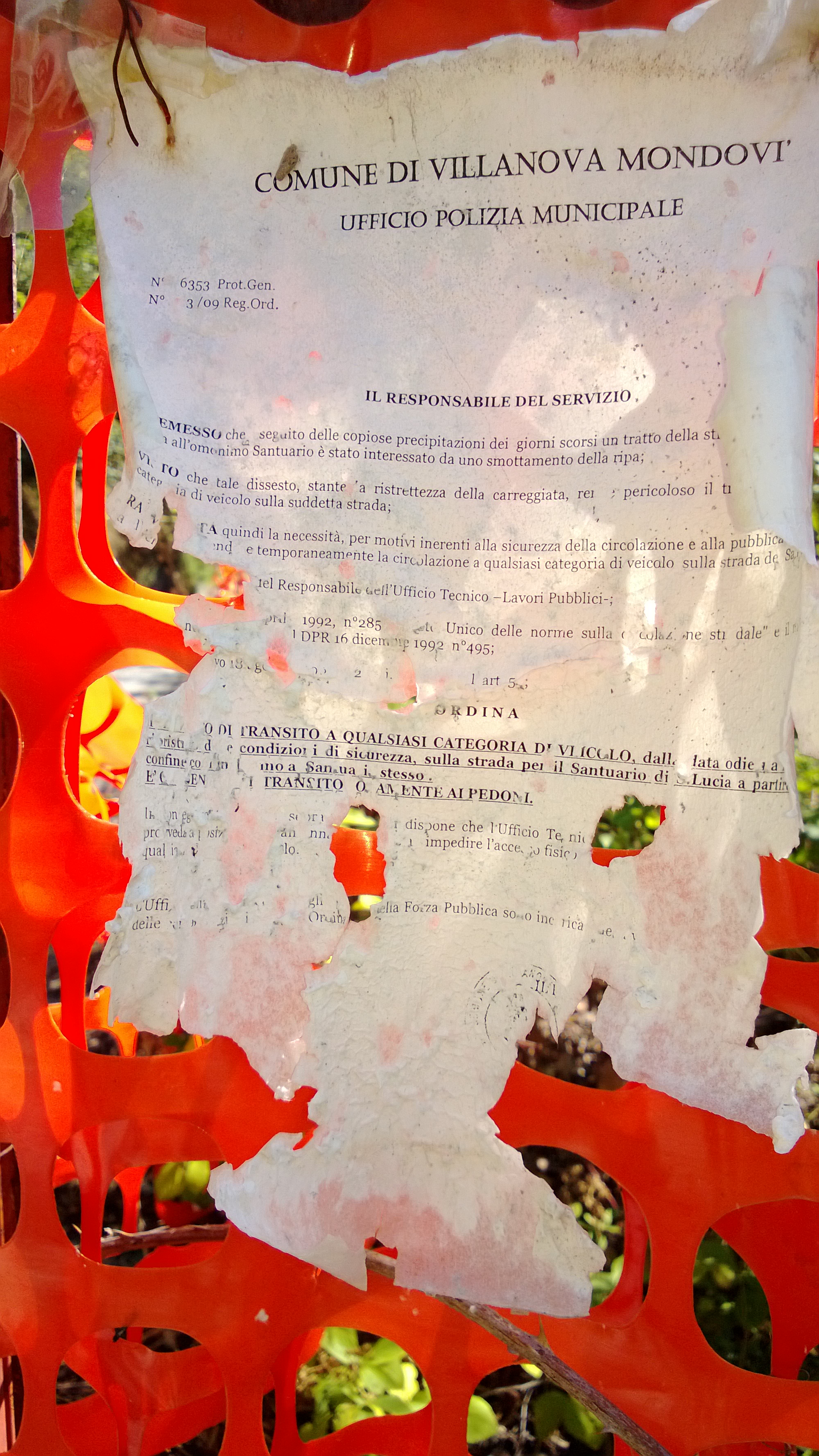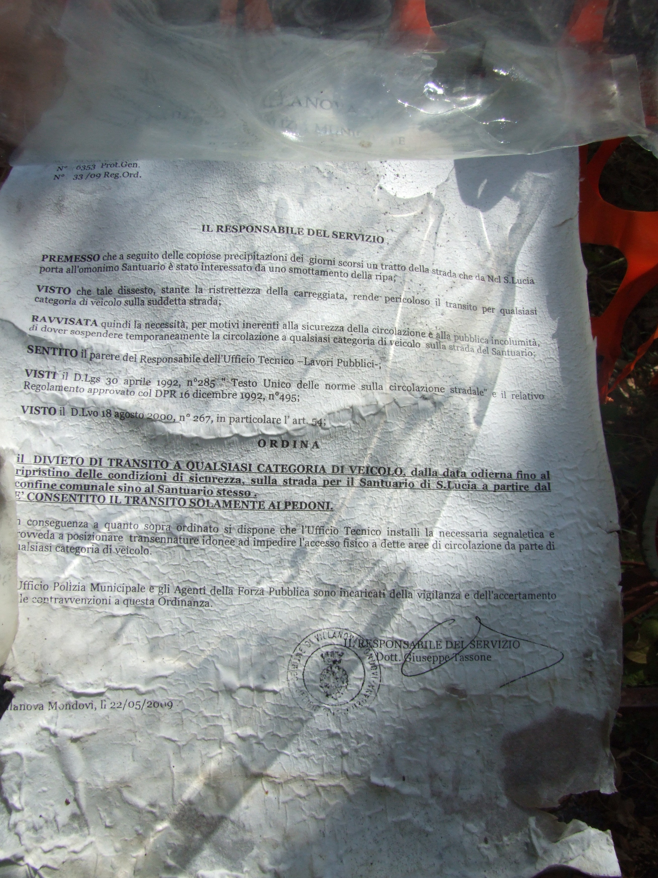 Anche il Santuario di Santa Lucia è ormai semi abbandonato e dopo uno smottamento della strada di accesso (avvenuto nel lontano 2009), solo quest’anno (2012) l’abbiamo trovata parzialmente ripristinata, sebbene risulti ancora percorribile sono a piedi e persista il divieto di accesso per gli autoveicoli (anche se ho constatato che spesse volte il divieto non viene rispettato anche perché è meta di persone anche anziane per le quali il percorso a piedi, seppur breve, risulterebbe assai difficoltoso).