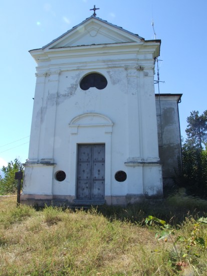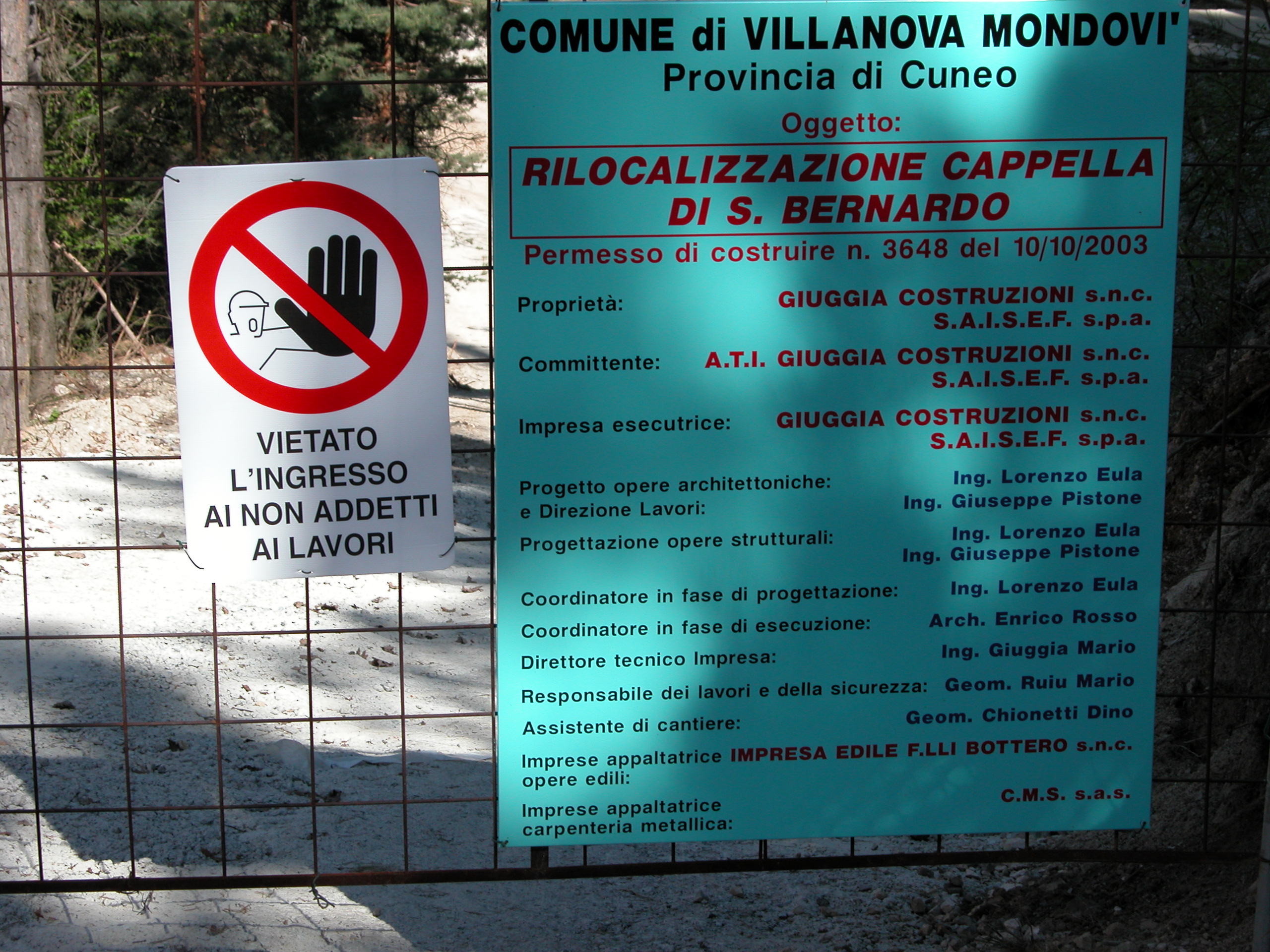 P.S. 2020 – Ora che non solo è stata spostata in un posto infimo, in fondo a una conca dove la vista è nulla, ma un inutile cancello di ferro impedisce l’accesso addirittura nella tettoia antistante la cappella, i cui interni quindi non si possono più non solo visitare, ma neppure intravvedere dalle feritoie delle finestrelle! Vedi Villanova Mondovì: dietro la cappella di San Bernardo nuovo “belvedere”… con vista sulla cava!