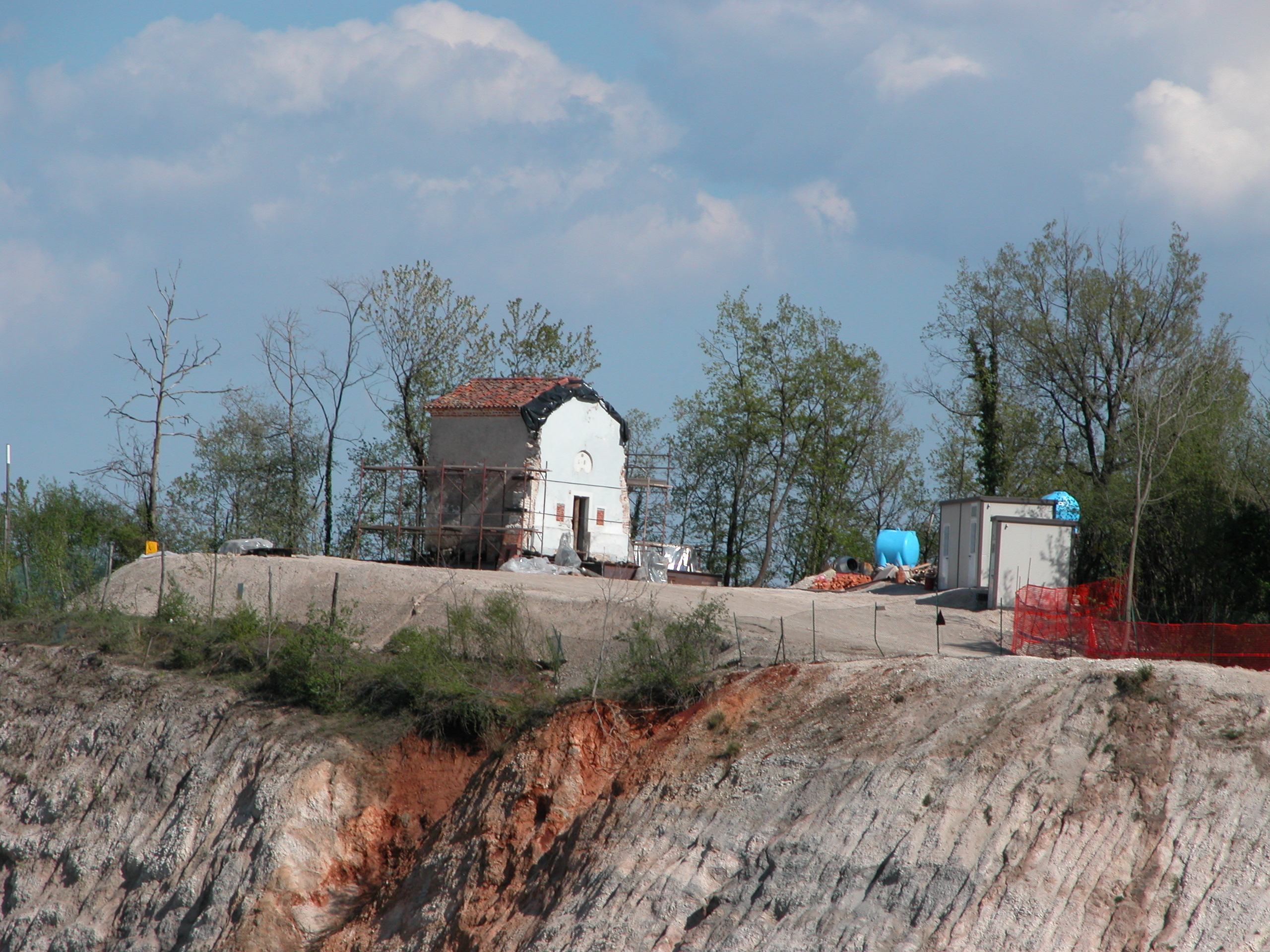 Ecco la cronistoria fotografica dello spostamento addirittura di tutta la Cappella di San Bernardo in quanto era sotto tutela dei Beni Culturali ma intralciava il proseguo degli scavi. Le prime foto, che ho inserito in questo post, sono relative alla Cappella nella sua collocazione iniziale, dove si poteva ammirare sia il bel paesaggio (Villavecchia sulla sinistra) sia si poteva entrare sempre nella cappella per visitarla e … magari ripararsi da un temporale! Attualmente spostata e ricostruita a qualche centinaio di metri con un’opera ciclopica e sicuramente costosa (sebbene opportunamente pubblicizzata in senso positivo da iniziative locali) risulta accessibile nuovamente solo da quest’anno e solo esternamente, dopo più di otto anni dall’inizio lavori; inoltre non risulta segnalata da nessun cartello turistico e risulta infine perennemente chiusa (inizialmente solo due piccole grate permettevano di vederne l’interno in minima parte, come testimoniano le foto seguenti, ma con la collocazione di un assurdo cancello, neppure questo è più possibile!).