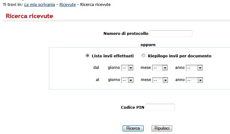 Andando nel sito ed accedendo con le proprie credenziali, risulta infatti nella sezione “La mia scrivania” la presenza di file di ricevute da prelevare. L’immissione del PIN viene richiesto come al solito per ogni operazione anche di lettura. Per riuscire poi a recuperare il file di ricevuta, nuovamente ci si scontra con una procedura non particolarmente agevole che richiede necessariamente una ricerca per intervallo di date o il numero di protocollo (che tuttavia non viene indicato nella notifica arrivata via email/SMS, per cui difficilmente uno se l’è annotato!): non sarebbe più comodo mostrare per default le ricevute ancora da leggere dal momento che si è giunti in quella sezione dal link che appunto segnalava nuove ricevute?