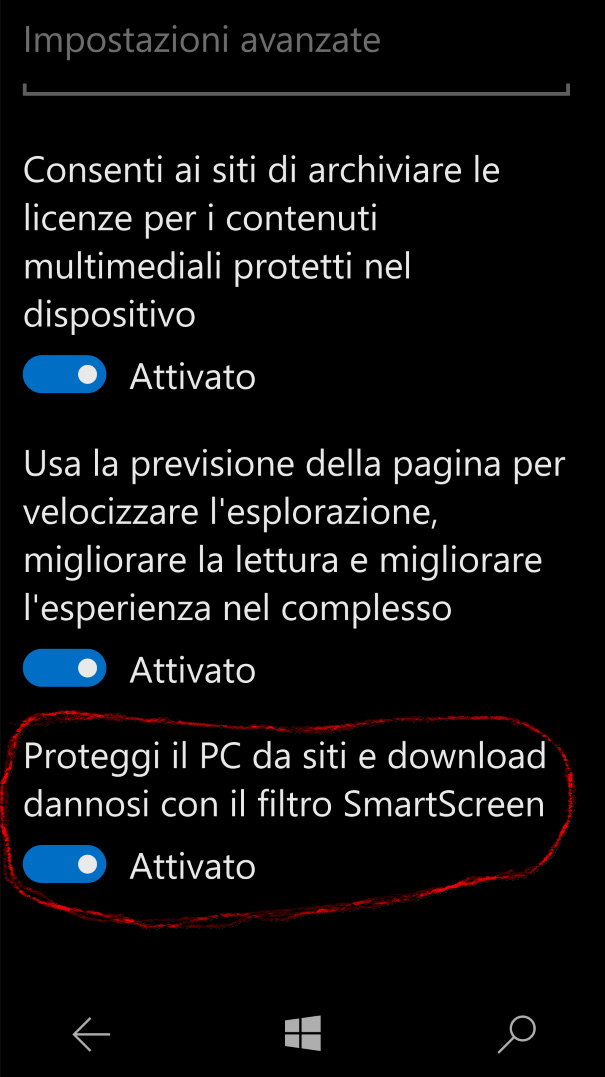 Finally the built-in Edge browser supports protection from malicious sites, set on as default: you can handle this option going in the Microsoft Edge’s … -> Options -> Settings – Advanced settings -> Help protect me from malicious sites and downloads with SmartScreen Filter [IT: … -> Impostazioni -> Visualizza impostazioni avanzate -> Proteggi il PC da siti e download dannosi con il filtro SmartScreen].