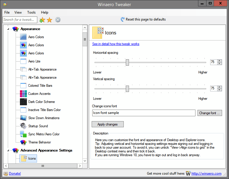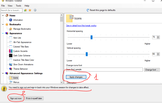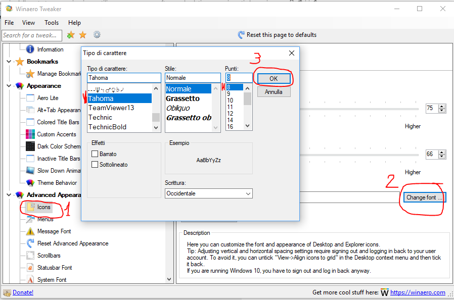 Se si utilizza invece il programma Advance System Font Changer, la procedura è simile e comporta sempre il cambiamento del font per le icone in modo che abbiano dimensioni minori (e.g. Tahoma 8):