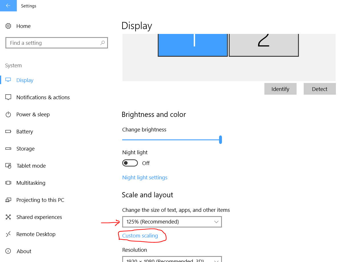 Si consiglia di utilizzare in Settings -> Display l’impostazione di Scale and layout e, se si vuole il font ancora più grande o più piccolo di quanto permesso dalle voci della combobox, eventualmente utilizzare il link sottostante di Custom scaling che permette solo di modificare la percentuale di dimensione dei font da 100% a 500% … nulla relativamente al tipo di font e alla possibilità di distinguere se relativi ad icona o quant’altro … 😦