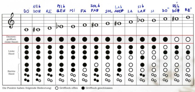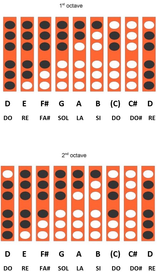 Il RE (D) alto può essere fatto nello stesso modo di quello basso. Il DO (C) naturale può essere suonato chiudendo per metà il primo foro – può essere più semplice, specialmente quando si suona l’ottava