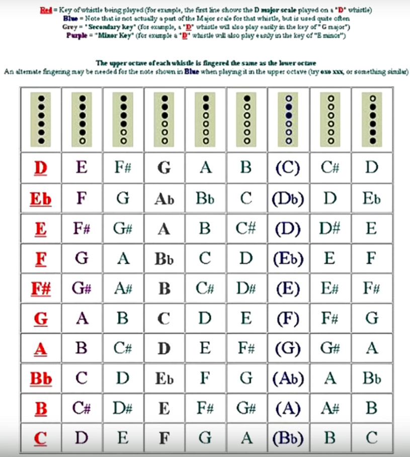 - Rosso: “Chiave” del Whistle che si sta suonando (e.g. la prima riga mostra la scala D Maggiore su un Whistle in D