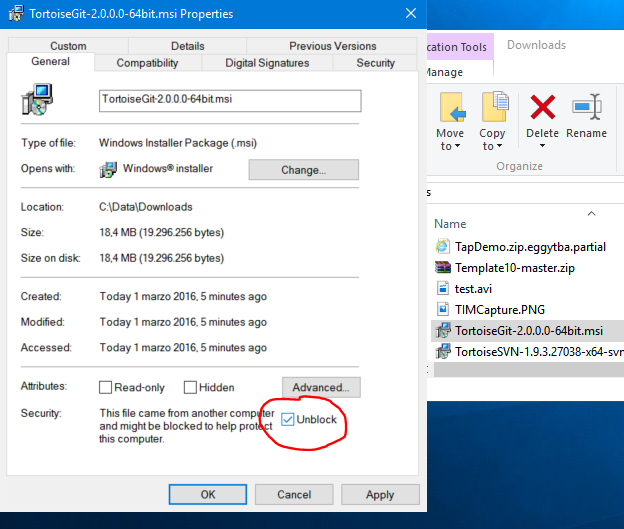 IF YOU ARE SURE THAT THE EXE FILE COMES FROM A SECURE SOURCE you can unblock it from the its properties window (right click on the filename from the File Explorer), checking the unblock checkbox in the available in General tab, as shown in the following: