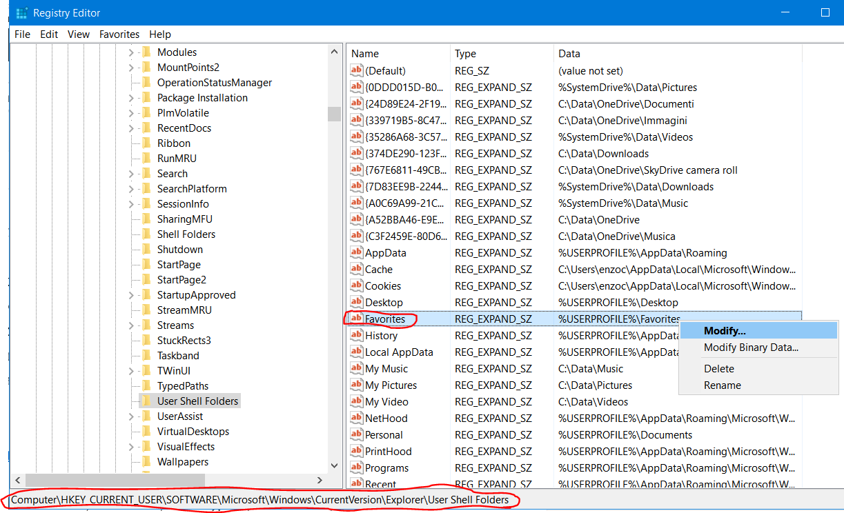 By default, its value should be %userprofile%\Favorites. - Modify its value to point to a common folder (e.g. C:\Data\Favorites). Make sure that the accounts you want to share favorite have the full control permission on that folder.