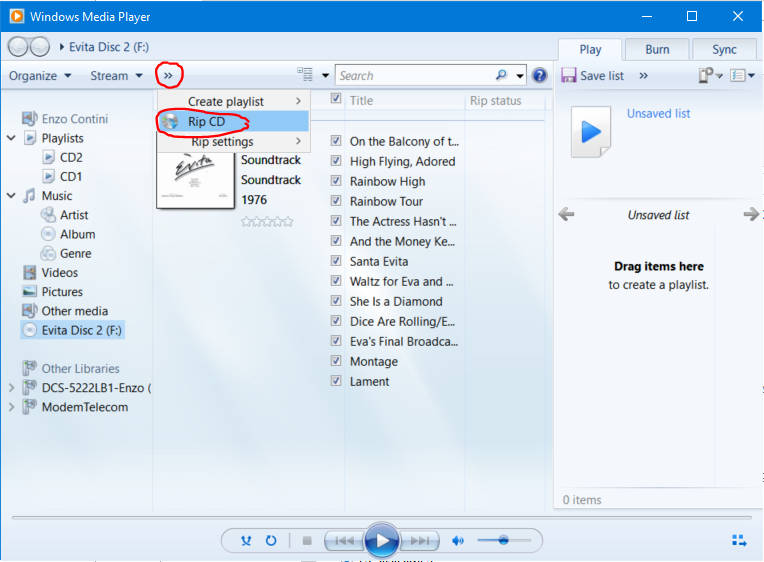 - The Rip CD item is enabled only if you select at least one track you want to rip.