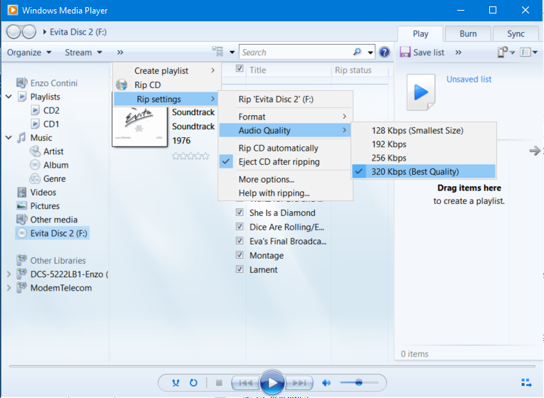 Before starting and ripping, you can possibly choose the best options for you, by going to Organize -> Options – Rip Music (or from >> -> Rip settings – Audio quality).
