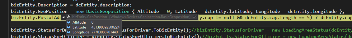 bizEntity.GeoPosition = new BasicGeoposition { Altitude = 0, Latitude = dcEntity.latitude, Longitude = dcEntity.longitude };