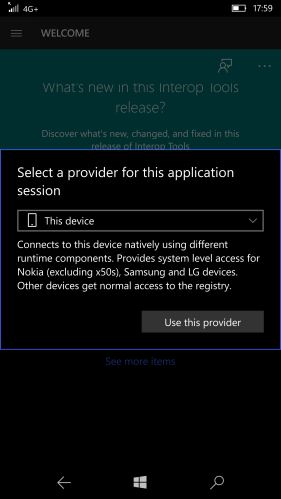 As said in this Gustave’s post, Interop Tools S (S stay for Store) relies exclusively on extensions to fully work (as those Windows versions didn’t support app extensions, Interop Tools can’t access your device directly), while Interop Tools L (L stays for Legacy) can work even without extensions. As stated in the ReadMe file available in the downloaded zip, “you don’t need provider extensions for this version to work with the registry, or the application manager. In no way this version requires you to use extensions. that version does support extensions as an option but you’re NOT required to have them. In the provider dialog showing up at start up you have multiple choices: