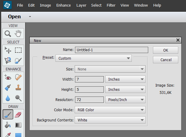 - Create a new canvas (File –> New). The default size of 7 inches by 5 inches (more or less 18 x 13 cm) at 72 ppi can already be fine.