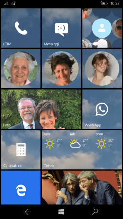 Il funzionamento base di Windows 10 Mobile segue infatti già la filosofia di estrema usabilità, richiesta a maggior ragione da un’utenza anziana: ad esempio basta effettuare il pin (cioè collocarne un quadrato associato per facilitarne l’accesso) sulla pagina di Start delle tile delle app che interessano o di contatti (impostando poi la massima dimensione quadrata) per raggiungere già il medesimo risultato funzionale visto nel Amplicomms M9000, con anzi altre ulteriori legate alla dinamicità dei contenuti di ciascuna “live tile”. Ad esempio, a ciascun contatto è possibile associare una foto: se inserito nella pagina di Start, tale immagine verrà mostrata nella “tile” associata, in modo da rendere più agevole chiamarlo. Sebbene le tile siano dimensionabili, conviene scegliere in genere la dimensione quadrata più grande che mostra in genere una grande icona auto esplicativa (e.g. Telefono, Messaggi, Calcolatrice, Fotocamera) o una immagine (e.g. per un contatto), mentre per alcune app (e.g. Foto, Notizie, Meteo) può essere conveniente scegliere la dimensione rettangolare che essendo più grande ancora consente una visualizzazione nella tile stessa di maggiori informazioni).