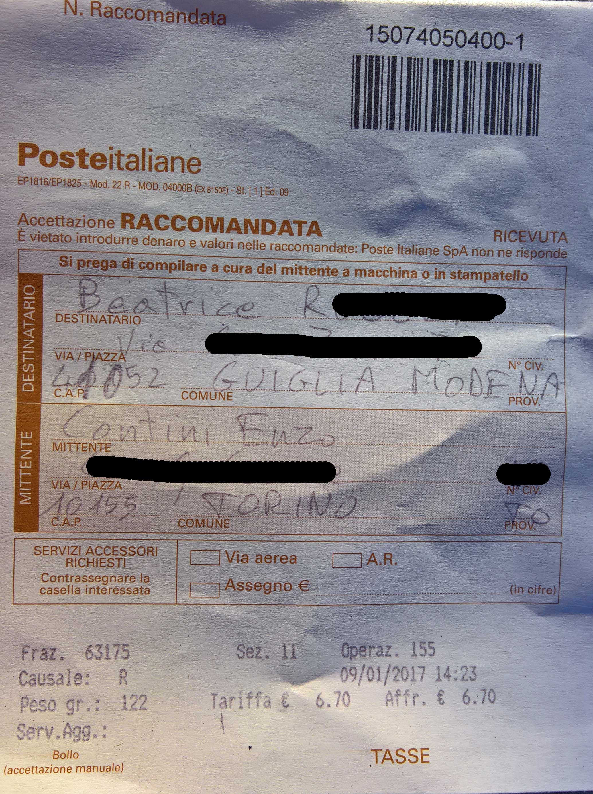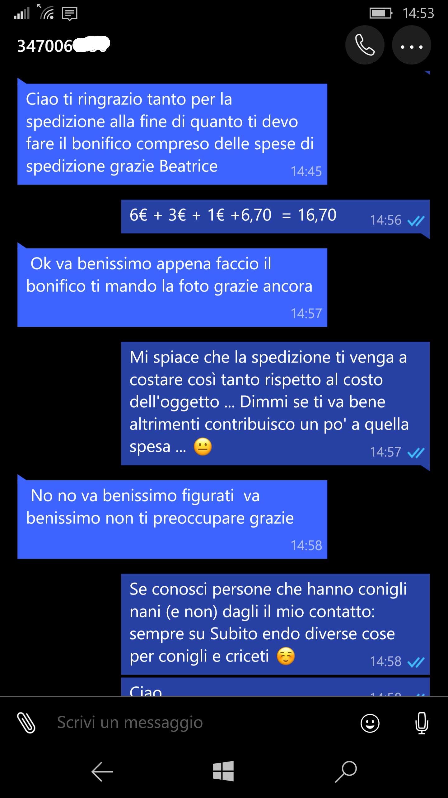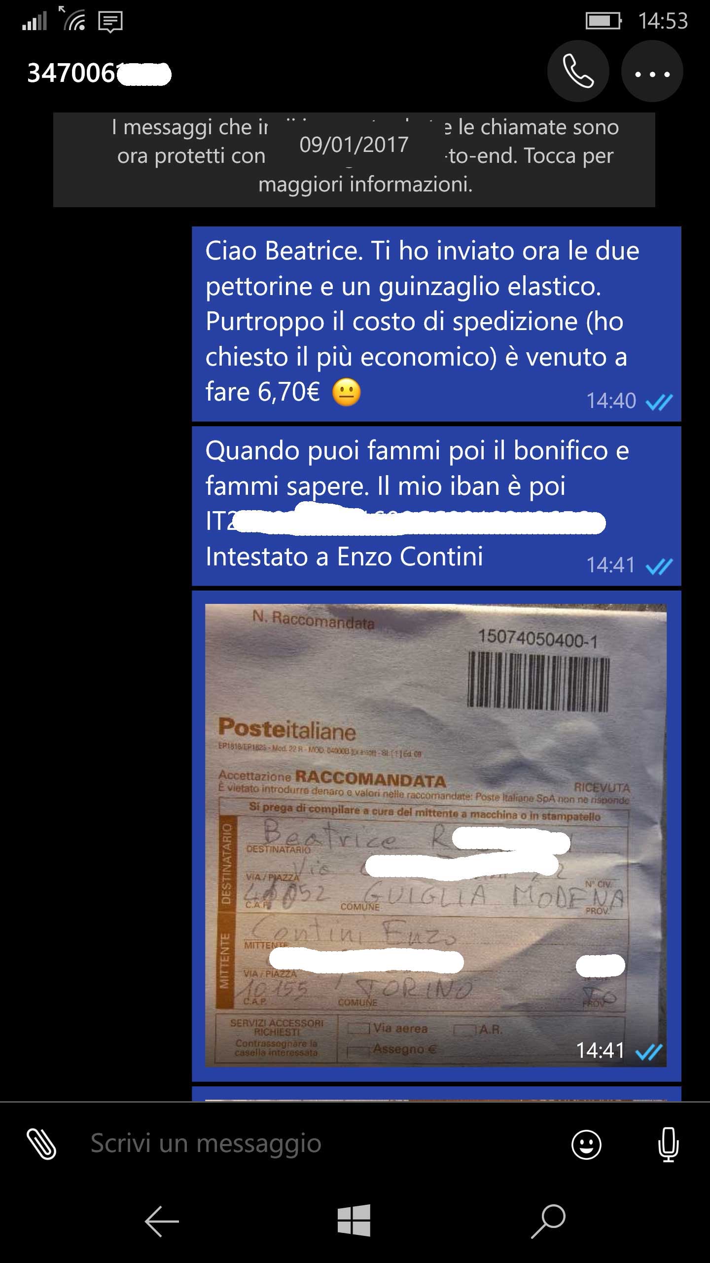 Ho messo in vendita sul sito Subito alcuni oggetti, taluni relativi ad accessori per animali tra cui dei guinzagli/pettorine. Ha risposto all’annuncio una ragazza/signora che via SMS e WhatsApp (associato al numero cellulare 347006xxxx) si è identificata come Beatrice fornendomi anche l’indirizzo a cui inviarle il pacco (Beatrice R., via xxxx xxxx xx Guiglia Modena 41052) con gli oggetti che vendevo, due pettorine ed un guinzaglio per animali di piccola taglia. Trattandosi di un oggetto di poco valore (16,70 € comprese le spese di spedizione) non ho reputato necessario richiedere un pagamento anticipato ed aspettare solo allora a spedire il pacchetto: d’altra parte lo scambio di messaggi mi aveva indotto a credere che si trattasse di una persona onesta. Avevo anche pensato: chi vuoi che si comporti in modo disonesto per una cifra così irrisoria, tanto più avendo tra l’altro anche fornito un numero di cellulare e l’indirizzo a cui recapitare l’oggetto?