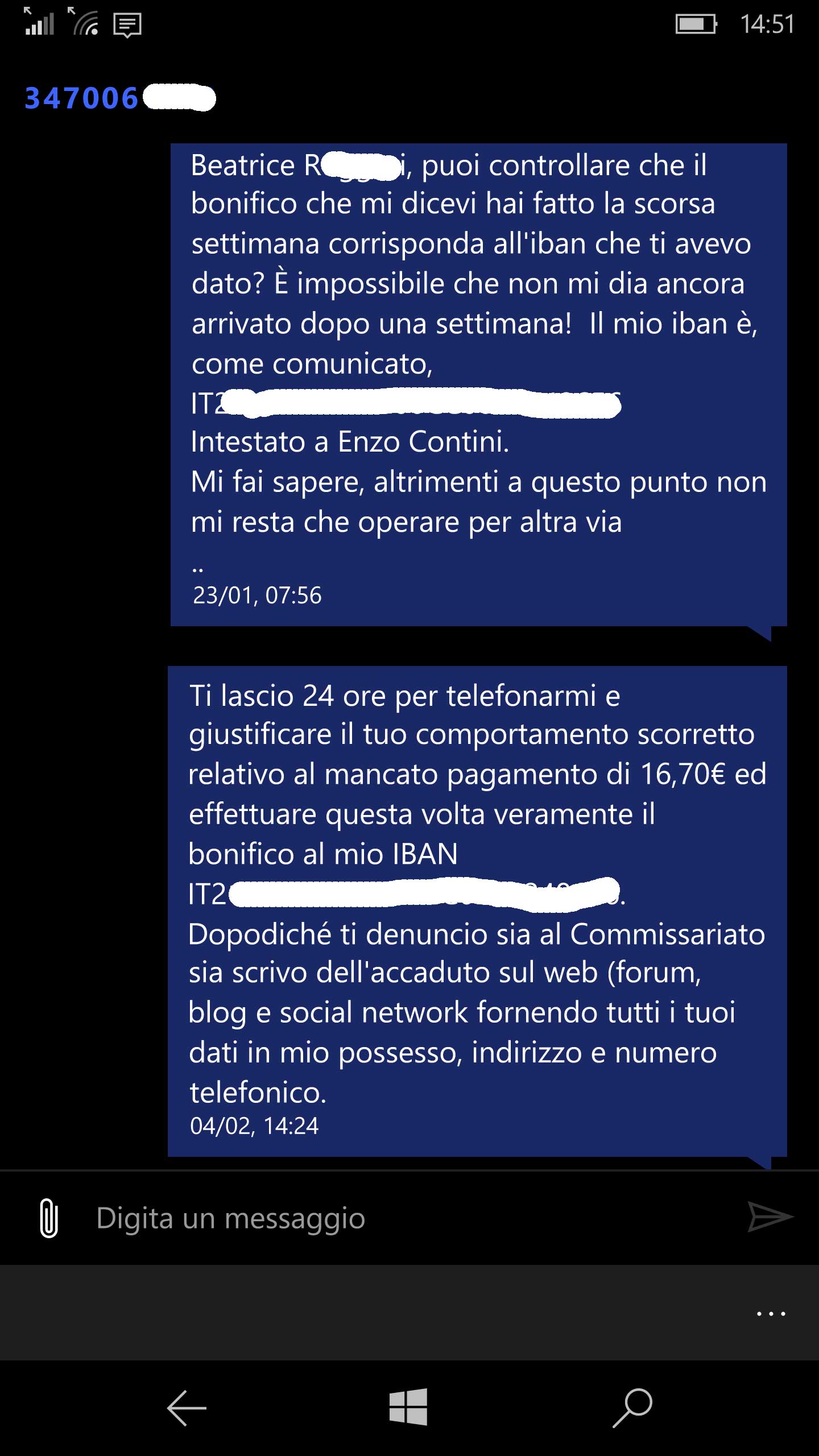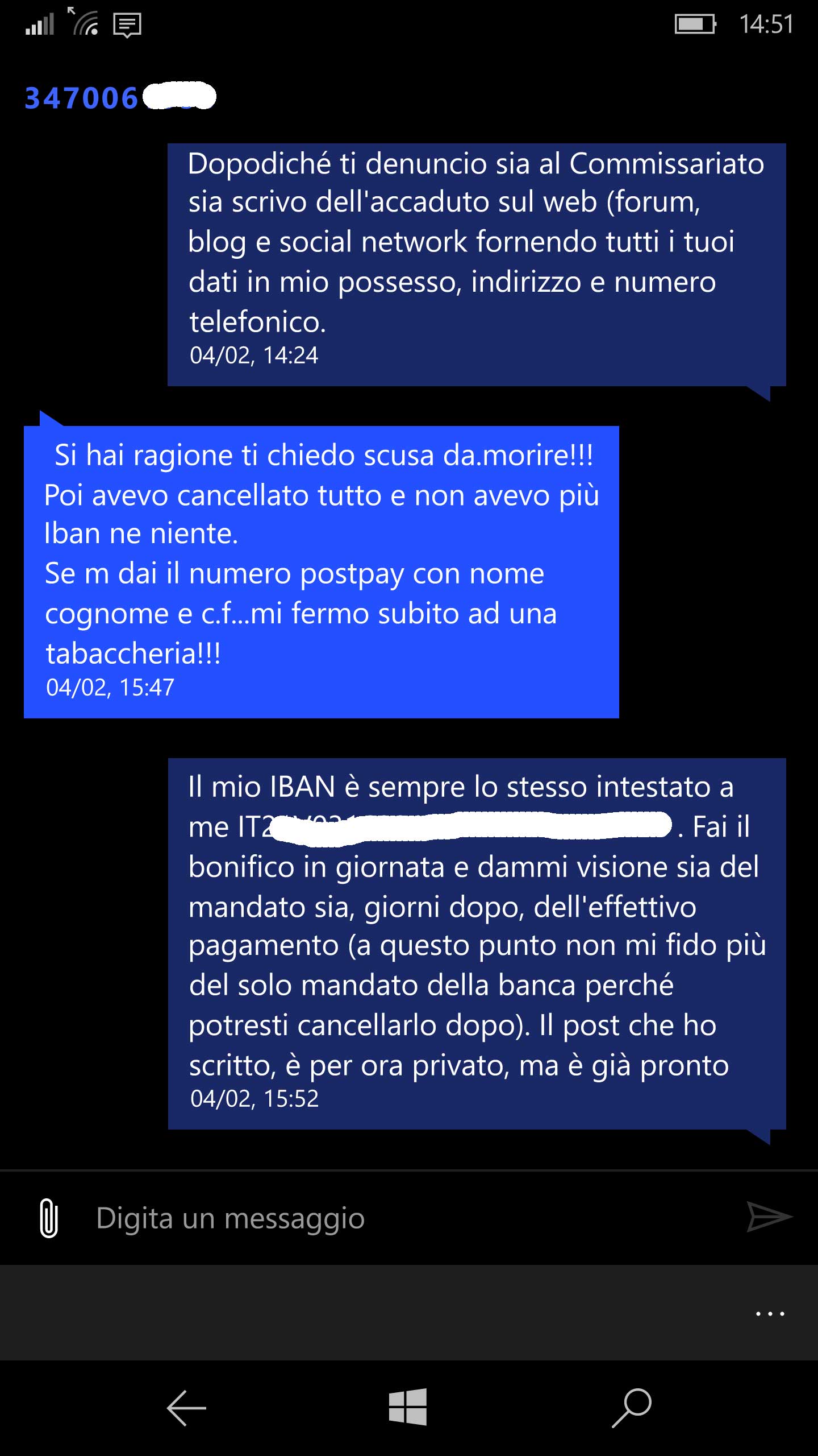 A questo punto, certo quindi al 100% della disonestà della persona, non mi è rimasta che la scelta che lasciarle un messaggio in segreteria (associato ad un SMS e messaggio WhatsApp) in cui le davo tempo 24 ore per contattarmi, giustificarsi del suo comportamento scorretto ed inviarmi la ricevuta del bonifico dopo avermelo effettuato, questa volta veramente: diversamente avrei diffuso su Internet ciò che mi è successo con tutti i dati in mio possesso (numero telefonico ed indirizzo con nome e cognome, che forse potrebbero non corrispondere alla persona disonesta ma che sicuramente corrispondono a dove mi ha detto di spedire il pacco).
