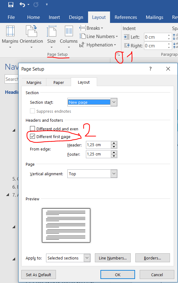 Select the page body of the new page section and open the Page Setup popup window (clicking on the little bottom right arrow of the Page Setup section of the menu).