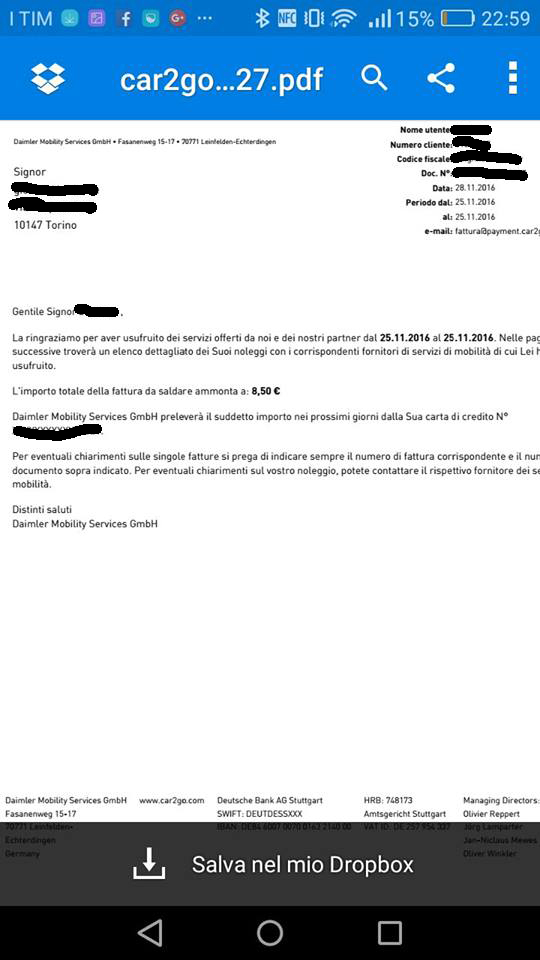 L’iscrizione a Car2Go è quindi molto semplice, è gratuita solo se vieni “presentato” da un amico che è già iscritto: in quel caso, non solo non si devono pagare i 9€ di iscrizione alla convalida della patente, ma si ricevono anche 30 minuti di noleggio gratuito, da utilizzarsi entro 30 giorni dalla convalida della patente da effettuare in uno di punti indicati nel sito dislocati in diverse zone della città (a Torino: Mercedes Benz – Corso Giulio Cesare 304 e Via Tito Livio 30; Legambiente – Via Maria Ausiliatrice 45; Europcar – Piazza Massaua 19/C; Autoscuola – Via Bertola 29; car2go – Piazza XXIV Maggio 12).