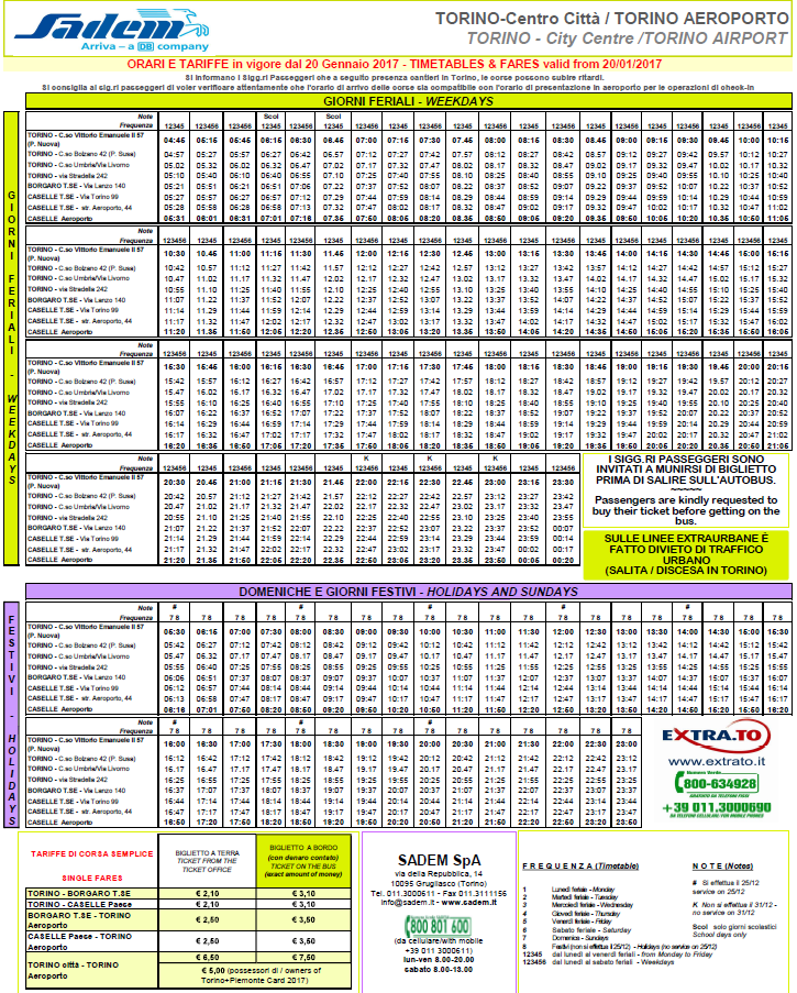 Dal sito SADEM , selezionando l’apposita icona dell’orologio, si può scaricare l’orario in pdf che riporto nel seguito anche se consiglio ovviamente di scaricare dal sito in quanto potrebbero essere più aggiornate. Le fermate previste sono: TORINO C.so Vittorio Emanuele II 57 (P. Nuova), C.so Bolzano 42 (P. Susa), C.so Umbria/Via Livorno, via Stradella 242, BORGARO T.SE Via Lanzo 140, CASELLE T.SE Via Torino 99, str. Aeroporto, 44, CASELLE Aeroporto.