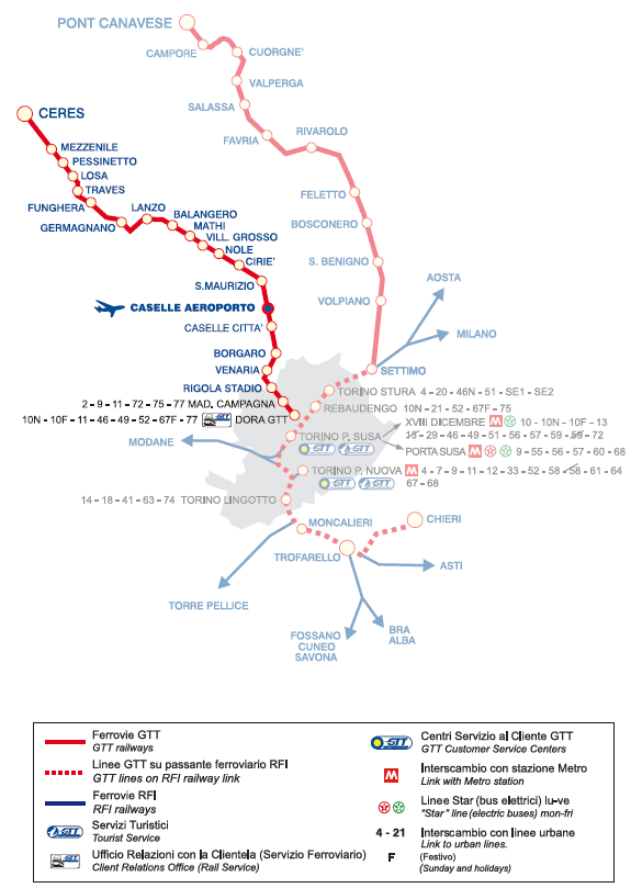 Si noti, in particolare, che solo pochi treni provengono dalla stazione di Porta Susa, mentre la maggior parte partono dalla stazione Dora GTT, passando quindi per le stazioni di Madonna di Campagna, Venaria, Borgaro, Caselle, Caselle Aeroporto, per poi proseguire per località più o meno remote (al massimo fino a Ceres).