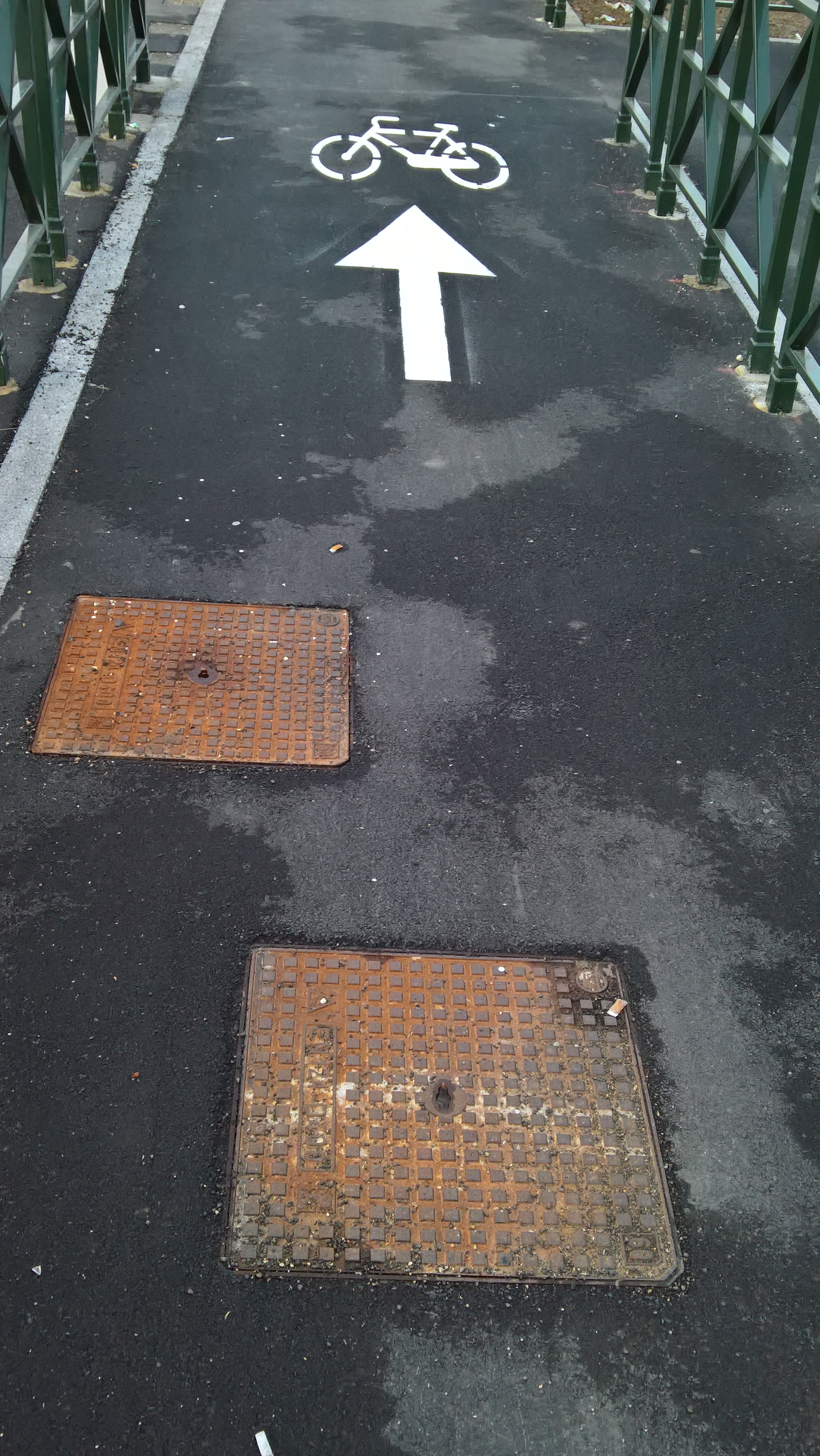 Possibile che nel 2016 chi progetta una pista ciclabile (con tanto di semafori dedicati ai ciclisti) non ci arrivi che NON È BUONA COSA prevedere, ogni 20 metri, 1, 2 o addirittura 3 tombini nel bel mezzo di percorrenza?? Era chiedere troppo collocarli altrove (e.g. sui paralleli percorso pedonale e striscia di prato alberato oppure sul lato della corsia stradale) ?