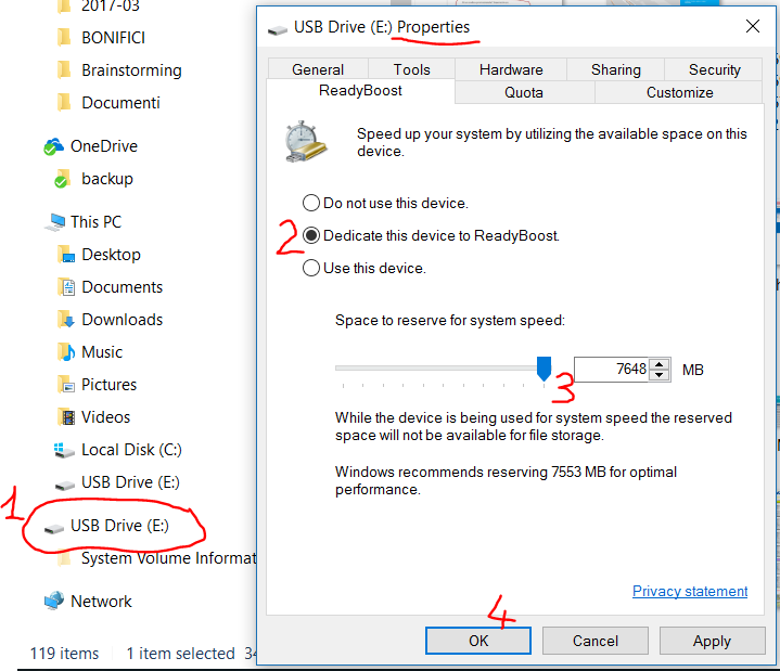 NOTA: dopo un aggiornamento di Windows 10 (e.g. update Windows Creator) può essere necessario impostare nuovamente la chiavetta per funzionare come ReadyBoost: comunque è agevole scoprirlo in quanto risulta nuovamente vuota, priva del ReadyBoost.sfcache file.