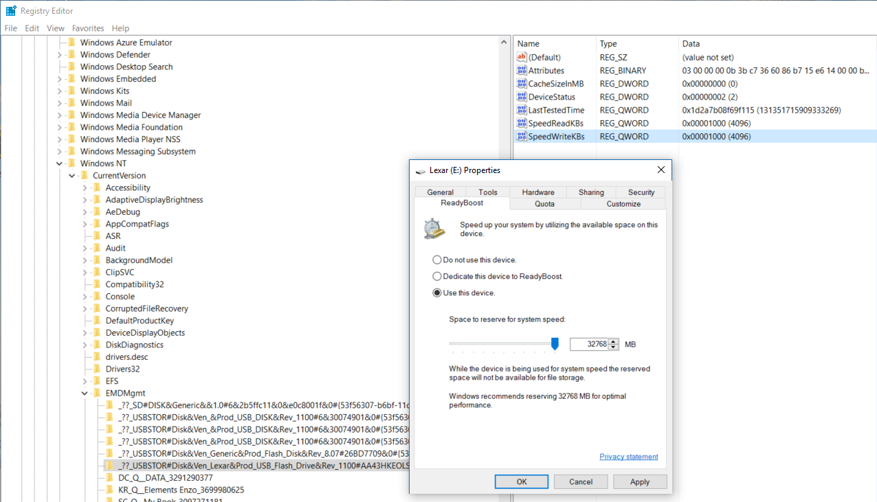 Ho letto quindi in un articolo che talvolta è necessario configurare a manina qualche chiave del registry relativa al drive associato alla chiavetta (vedi l’articolo This device cannot be used for ReadyBoost per maggiori dettagli). Nota che possono esserci nel path HKEY_LOCAL_MACHINE\SOFTWARE\Microsoft\Windows NT\Current Version\EMDMgmt più riferimenti alla tua chiavetta qualora tu l’abbia, ad esempio, formattata (e.g. io che l’avevo formattata una volta in NTFS avevo due riferimenti a quella chiavetta Lextar) per cui conviene innanzitutto cancellare tutti i riferimenti a quella chiavetta (method 2 indicato nell’articolo che talvolta potrebbe, secondo l’autore, risolvere di per se la problematica, con dopo un reboot, cosa che per me non ha sortito l’effetto desiderato): quindi si può procedere ad inserire nuovamente la chiavetta ed andare a modificare a mano alcune chiavi dell’ora unico riferimento alla chiavetta presente nel path HKEY_LOCAL_MACHINE\SOFTWARE\Microsoft\Windows NT\Current Version\EMDMgmt: