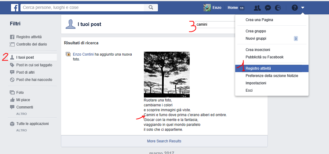 Tuttavia, mentre sembra assai facile (e.g. stampa dei propri post di un anno) per alcuni reperirli, previa propria autorizzazione, non è proprio immediato, secondo la mia recente esperienza, ritrovare in Facebook un proprio post remoto utilizzando l’interfaccia utente attualmente disponibile. Innanzitutto ho utilizzato, per accedere al mio account, il sito web on quanto purtroppo ho notato che spesso la versione web di un SW fornisca in genere più informazioni di quella app, sebbene sia magari meno usufruibile da dispositivi differenti, quale uno smartphone.