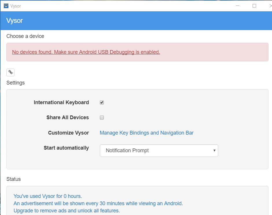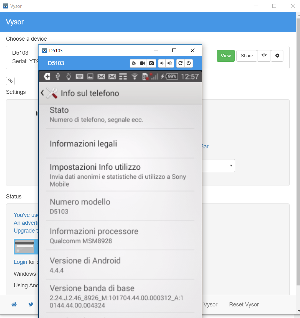 For both methods, you need to make Android Debugging enabled on your phone to being discovered (e.g. by Vysor app running on the PC). If you have not the Developer Options section in Settings, maybe you have to enable that section clicking more time on Build Number in Settings -> About Phone (IT: Impostazioni -> Info sul telefono): see, for example, How To Enable USB Debugging Mode Android. If USB Debugging mode is enabled, as soon you connect the Android smartphone to the PC via USB, a popup will ask your consent. Then an .apk is installed in the smartphone too. Last note: unfortunately, if you are using the free Vysor (not pro) version, every now and then an advertising …