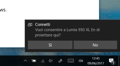 Alternatively you can ask the connection from the external device (e.g. from the Lumia 950XL smartphone ask the connection to a PC – e.g. SurfaceEnzoLab in the screenshots) and then agree, on the popup that will appear on the PC, that the screen of that device will be projected on that PC.