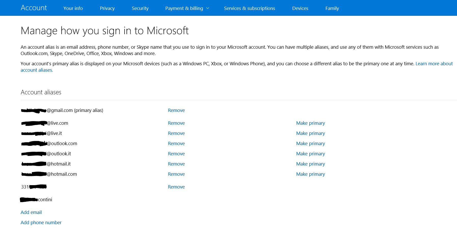 You can even add one or more alias to your account, creating a new email address (currently on outllok.com or outlook.it … for Italian 😉 clicking on the Add email link of the previous screenshot and navigating to Add an alias page (see also Add your other email accounts to Outlook.com):