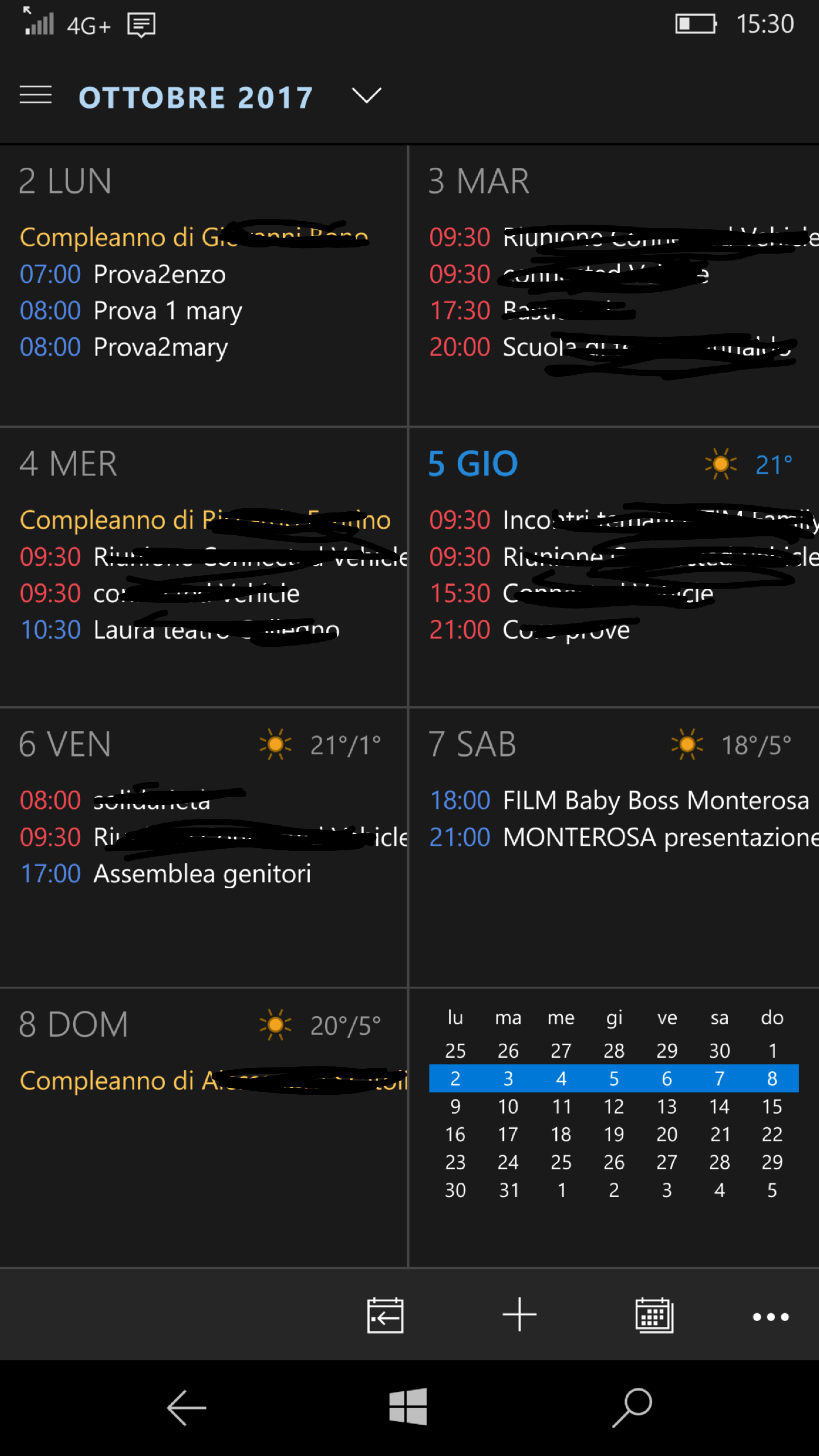 Note that the UI change a lot depending the size of the window, so if the UWP app is running on a PC/tablet full screen or on a smartphone (and this it not only a matter of a personalization done in the Settings section of the app!): the usability of a calendar app must be very well defined and it should take into account also the available screen dimension. If you resize a UWP app on a PC, (both in height and in width) you will see that the UI will change completely, till to be similar (but not the same!!) to the one available on a smartphone: therefore the same app adapt its UI appropriately to get always the user experience as better as possible!