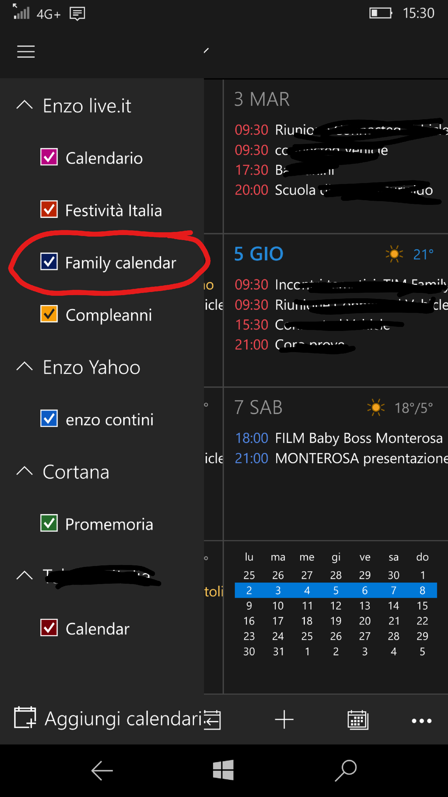 Note that there is also one new Calendar (the green one) associated to your personal Live/Outlook.com email: if you do not use it, you can click on X and it will not be displayed anymore!