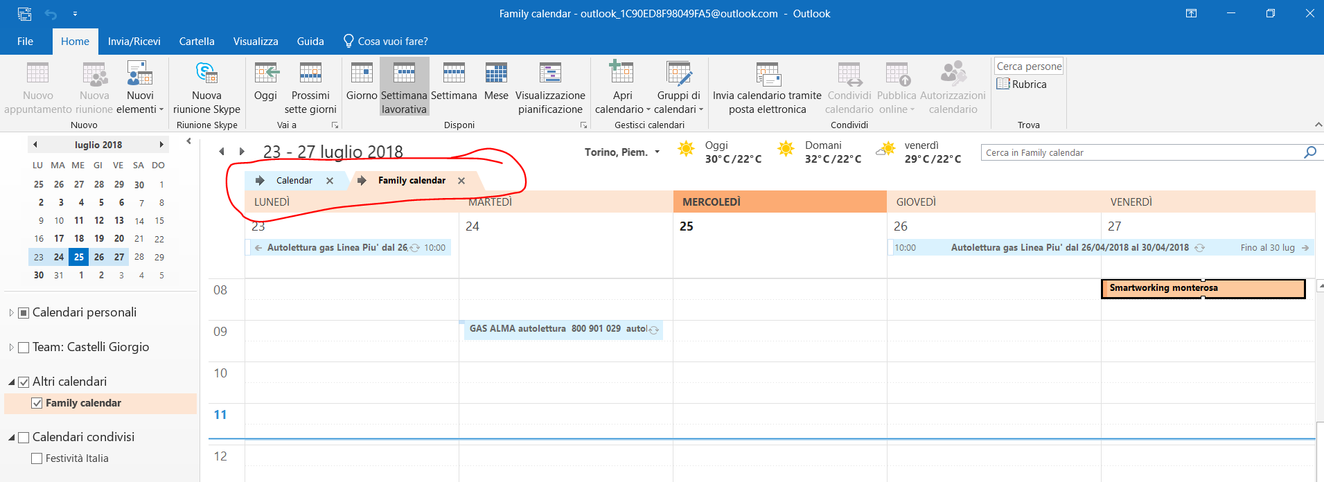 Then I tried to use it from the desktop version of Outlook 2016 (where I have my business email), adding my Microsoft account email (on live.it), but I had some problem in adding/modifying appointments: however I can see all the ones inserted with my smartphone or using Outlook.com with the browse. In fact the Family Calendar is a feature of the live.it/outlook.com email so you need to add that account of yours in Outlook 2016 too.