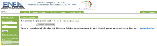 Andando quindi in quel sito relativo alle dichiarazioni ai fini detrazioni fiscali L.296/2006 per l’efficienza energetica dell’anno 2017, è necessario registrarsi se non lo si è già fatto, con la usuale procedura che prevede di premere sul pulsante di Registrati e quindi confermare la propria email tramite un messaggio inviato dal sito, inserendo il codice presente nella email stessa.