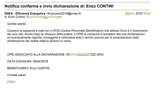 ATTENZIONE: se si è pagato il saldo dei lavori nel 2018 è necessario aspettare che venga pubblicato dall’ENEA il nuovo form per introdurre i dati relativi ai lavori effettuati: infatti il modulo preparato ler la finanziaria 2017 non consente di inserire una data di fine lavori superiore al 31 dicembre 2017, per cui tutte le ricevute, anche quella di saldo, devono essere precedenti a quella data. Come specificato nel loro sito, “il nuovo sito ENEA “http://finanziaria2018.enea.it”, per trasmettere i dati relativi agli interventi di riqualificazione energetica degli edifici conclusi a partire dal 1° gennaio 2018 sarà attivato dopo la pubblicazione dei decreti con le nuove disposizioni tecniche e procedurali attuative della legge di Bilancio 2018. L’eventuale deroga rispetto alla scadenza di 90 giorni dalla data di chiusura dei lavori per l’invio verrà comunicata non appena possibile.”