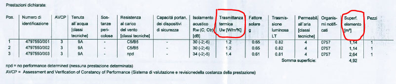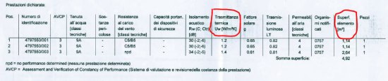 Per inserire i dati richiesti è necessario avere la dichiarazione del fabbricante degli infissi dove viene indicato per ciascuno la sua trasmittanza termica e la superficie coperta, come ad esempio mostrato nelle seguenti immagini relative a 4 infissi: