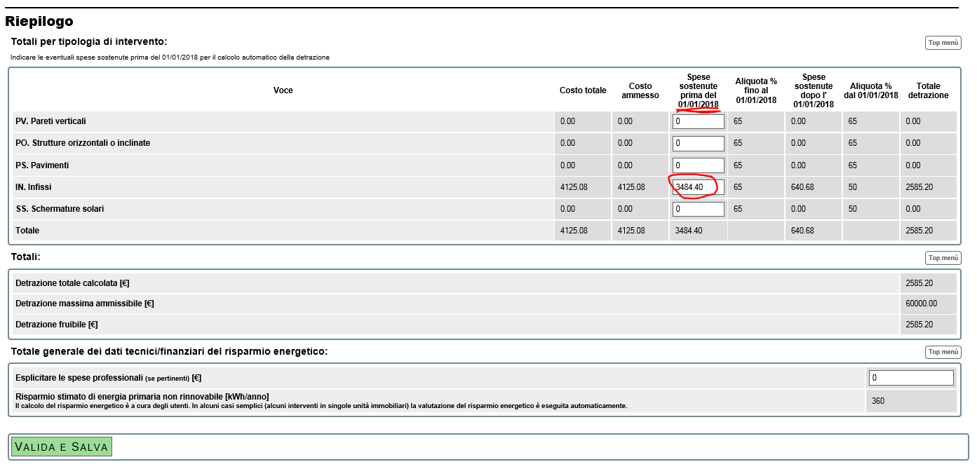 Se si sono dati acconti per l’anno precedente (e.g. 2017), è necessario indicarlo nella sezione Riepilogo, in modo che le percentuali di detrazione vengano calcolate correttamente, essendo generalmente differenti anno per anno (e.g. 65% nel 2017, 50% nel 2018).