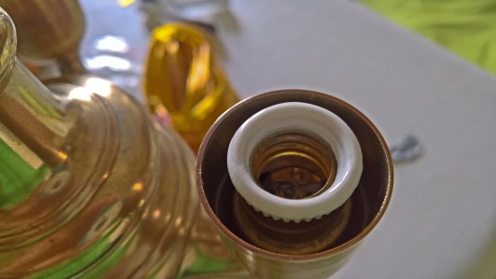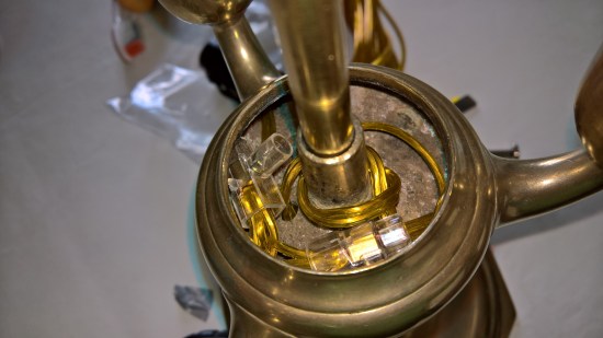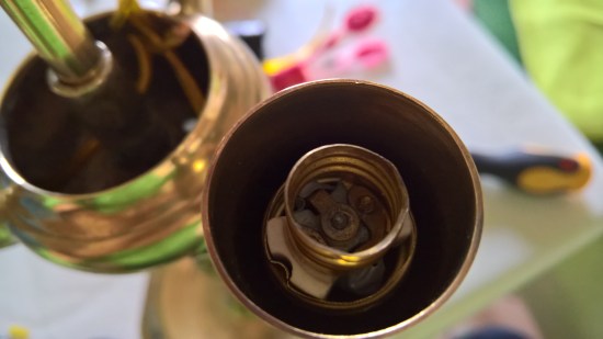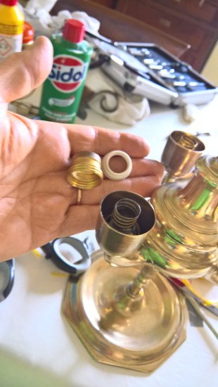 La fase più complessa, che necessita magari dell’ausilio di un professionista, è filettare opportunamente i tre fori dove un tempo fuoriusciva la fiamma, in modo da poterci avvitare dei portalampada per lampadine con attacco E14 con rispettive coperture in ottone. In alternativa si potrebbero saldare, ma il risultato non penso sarebbe ottimale.