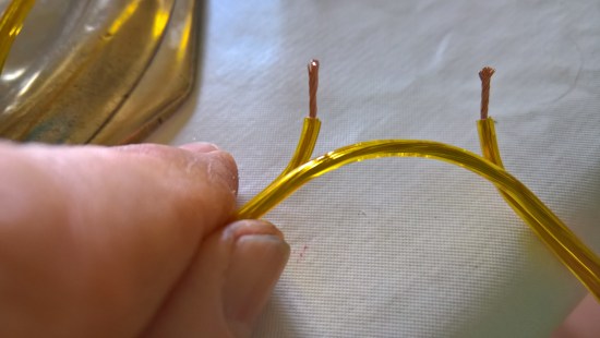 Passo 5 – Con l’apposita forbice per elettricisti, spelare gli estremi di ciascun filo ed unire tra loro i filamenti di ciascuna coppia, sia dei cavi provenienti dai tre rami della lampada sia di quello di alimentazione proveniente dal foro realizzato nel ex-contenitore dell’olio: in tale modo si porta a ciascuna lampadina un neutro ed una fase, idonei ad una sua sua alimentazione.