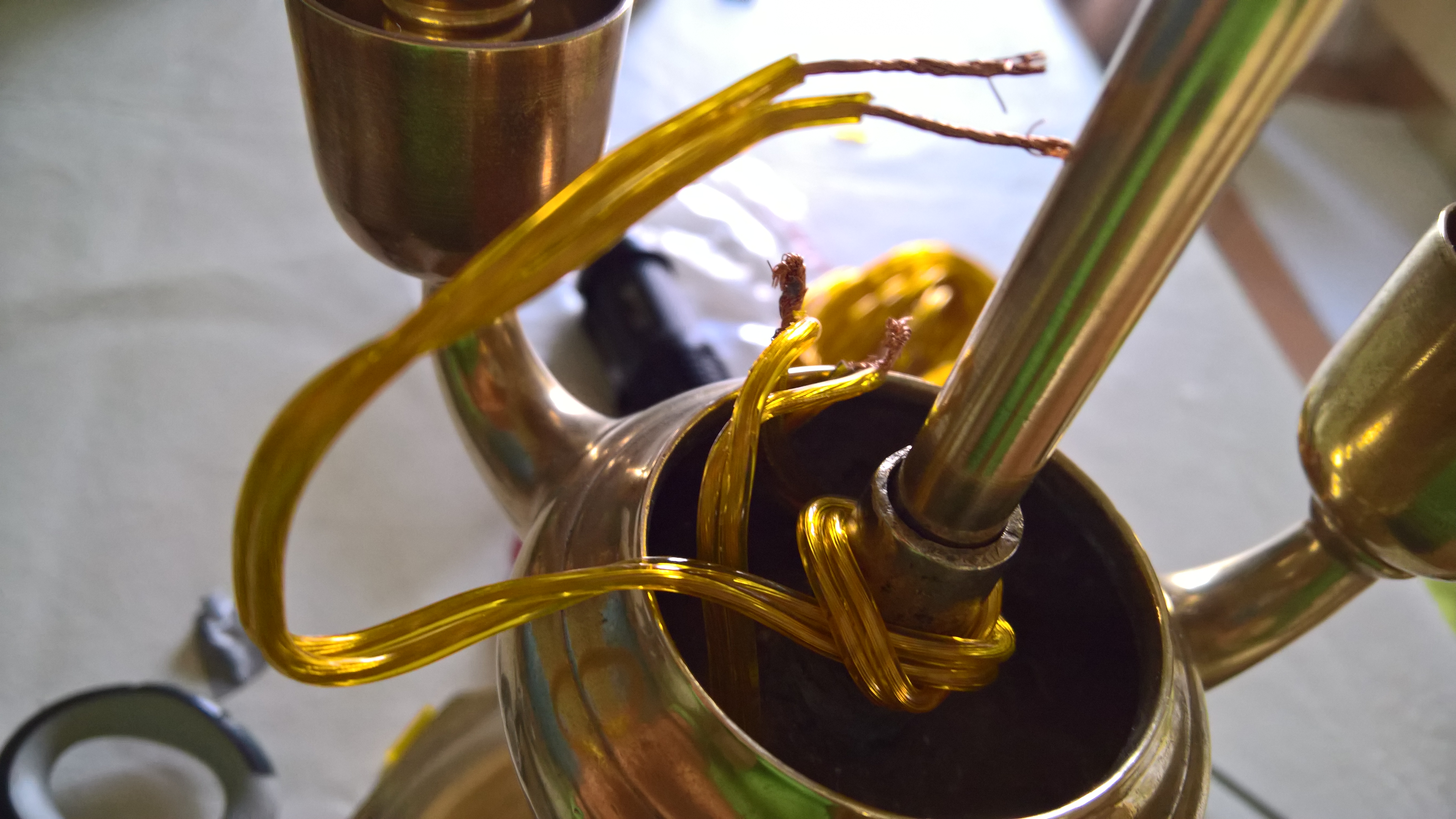 Annodare, sull’asta di ottone che sorregge la lampada, il cavo proveniente dal foro, in modo che non possa subire trazioni esterne. Unire tra loro un filo di ciascuna coppia(fili provenienti dai tre rami della lampada e quello di alimentazione proveniente dal foro).