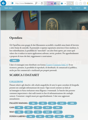 Ad esempio, la Fondazione Torino Musei fornisce l’accesso all’archivio fotografico Gabinio: le immagini non ad alta definizione vengono rilasciate gratuitamente come OpenData in diversi formati (XML, CSV, XLS, XLSX, JSON). Oltre all’archivio del Fondo Gabinio, sono disponibili, su quel medesimo sito, anche dataset su Palazzo Madama, GAM e MAO. Si legge che sono presenti i “dataset relativi agli elenchi e alle schede anagrafiche di tutte le opere corredate di fotografia presenti nei cataloghi informatizzati dei musei” e che questi “dati sono aggiornati annualmente” niente male!