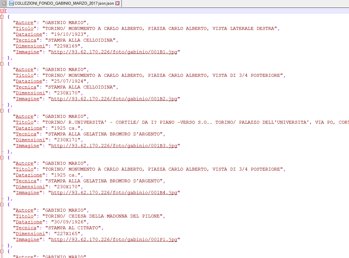 Scaricando, ad esempio il file contenente gli OpenData in formato json, generalmente quello più utilizzato quando il contenuto deve essere inviato e processato da una applicazione client, si ottiene un file con i seguenti dati strutturati su cui si possono agevolmente effettuare, tramite la funzionalità di Cerca dell’editor, delle ricerche su termini specifici (e.g. ricerca sul termine Michelotti), in modo da individuare le immagine di interesse: in particolare, associata a ciascuna immagine è indicata l’URL da utilizzare per scaricarla (e.g. http://93.62.170.226/foto/gabinio/001B1.jpg), oltre ad altre informazioni interessanti quale ed esempio la sua presunta datazione.