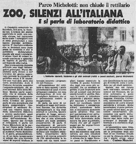 Ovviamente in quell’archivio di decine di anni sono moltissimi gli articoli relativi al parco Michelotti ed allo zoo in particolare … ma è già troppo tempo che tengo questo port privato ed è penso ora di pubblicarlo comunque: per ora ne ho riportati solo alcuni articoli, proponendomi nel tempo di inserirne ulteriori, dopo averli ricercati e letti 😉