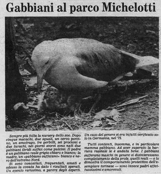 Gabbiani al parco Michelotti Sempre più folta la nursery dello zoo. Dopo cinque macachi, due squali, un cervo porcino, un amotrago, tre gerbilli, sei procioni e due turachi, nei giorni scorsi sono nati due gabbiani ibridi soffici come pulcini. Il padre è un gabbiano reale grigio chiaro e bianco;…