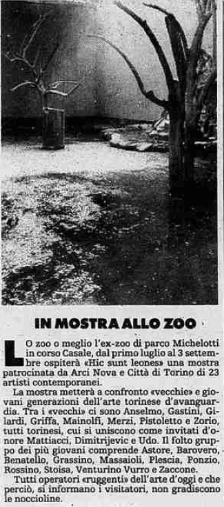 ALL’EX ZOO Artistici ruggiti di vecchi e giovani leoni dell’ex zoo di Torino, per la prima volta, vengono presentate opere di artisti noti e di giovani. Entrando, nello stagno che una volta era degli aironi si è sistemata Nunzia Plescia con una scultura bianca in vetroresina. Un fischio acuto attira l’attenzione …