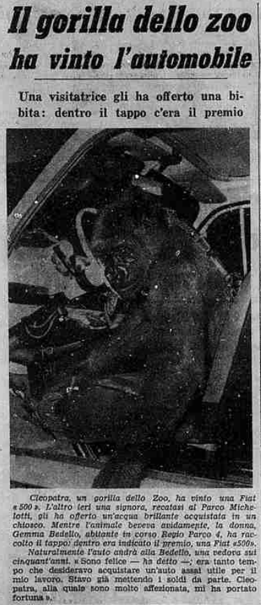 Cleopatra, un gorilla dello Zoo, ha vinto una Fiat «500». L’altro ieri una signora, recatasi al Parco Michelotti, gli ha offerto un’acqua brillante acquistata in un chiosco. Mentre l’animale beveva avidamente, la donna. Gemma Bedello, abitante in corso Regio Parco 4, ha raccolto il tappo: dentro era indicato il premio, una Fiat «500». Naturalmente l’auto andrà alla Bedello, una vedova sui cinquant’anni. « Sono felice — ha detto — Era tanto tempo che desideravo acquistare un’auto assai utile per il mio lavoro. Stavo già mettendo i soldi da parte. Cleopatra, alla quale sono molto affezionata, mi ha portato fortuna».