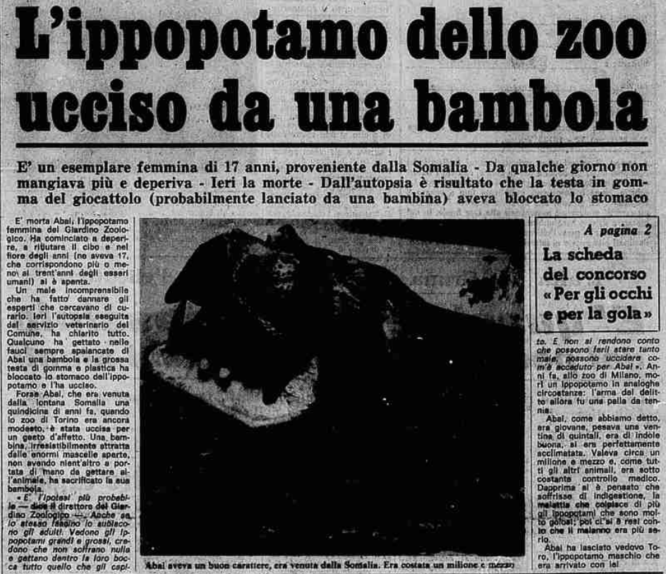 E’ morta Abal, l’Ippopotamo femmina del Giardino Zoologico. Ha cominciato a deperire, a rifiutare il cibo e nel fiore degli anni (ne aveva 17, che corrispondono più o meno ai trent’anni degli esseri umani) si è spenta. Un male incomprensibile che ha fatto dannare gli esperti che cercavano di curarlo. Ieri l’autopsia eseguita dal servizio veterinario del Comune, ha chiarito tutto. Qualcuno ha gettato nelle fauci sempre spalancate di Abal una bambola e la grossa testa di gomma e plastica ha bloccato lo stomaco dell’ippopotamo e l’ha ucciso. Forse Abal, che era venuta dalla lontana Somalia una quindicina di anni fa, quando lo zoo di Torino era ancora modesto: è stata uccisa per un gesto d’affetto. Una bambina, irresistibilmente attratta dalle enormi mascelle aperte, non avendo nient’altro a portata di mano da gettare all’animale, ha sacrificato la sua bambola. « E’ l’ipotesi più probabile — dice il direttore dei Giardino Zoologico. Anche se lo stesso fascino lo subiscono gli adulti. Vedono gli ippopotami grandi e grossi, credono che non soffrano nulla e gettano dentro la loro bocca tutto quello che gli capita e non si rendono conto che possono farli stare tanto male, possono uccidere, come è capitato ad Abel». Anni fa, allo zoo di Milano, morì un ippopotamo in analoghe circostanze: l’arma del delitto allora fu una palla da tennis. Abal, come abbiamo detto, era giovane, pesava una ventina di quintali, era di indole buona, si era perfettamente acclimatata. Valeva circa un milione e mezzo e, come tutti gli altri animali, era sotto costante controllo medico. Dapprima si è pensato che soffrisse di indigestione, la malattia che colpisce di più gli ippopotami che sono molto golosi. Abal ha lasciato vedovo Toro, l’ippopotamo maschio che era arrivato con lei.