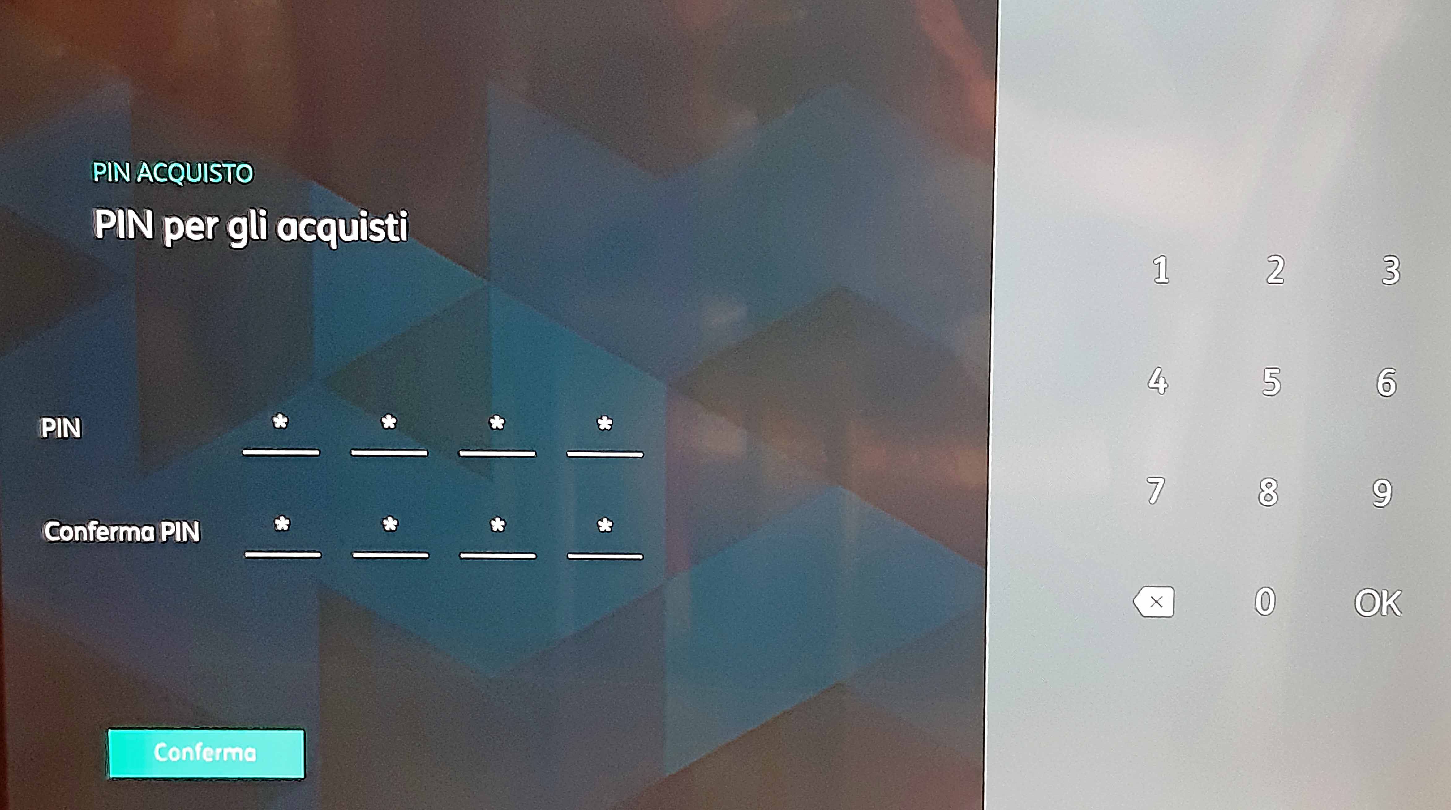 SI noti che al primo accesso può essere richiesto l’inserimento (e la conferma) di un PIN di quattro cifre (scelto dall’utente agendo sulla tastiera a destra) che renderà sicuro l’eventuale acquisto di film a pagamento: conviene quindi segnarsi bene quello scelto in modo da poter effettuare in futuro anche acquisti che verranno accreditati direttamente sulla bolletta telefonica se si è utenti TIM.